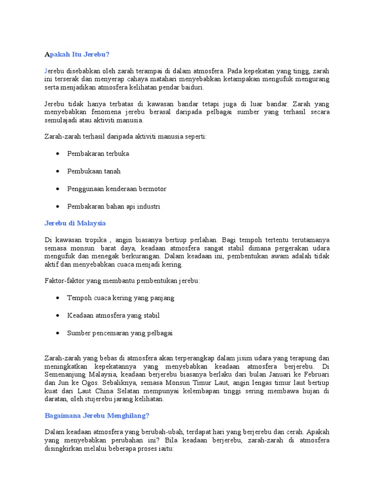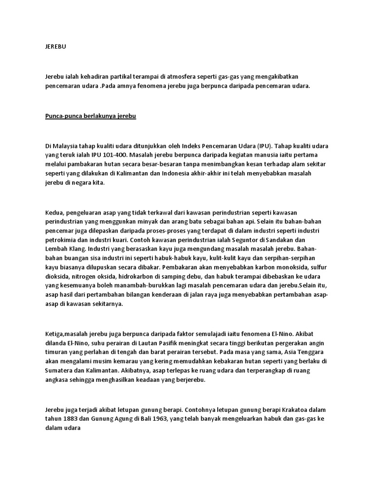 Kesan Pencemaran Udara Karangan from imgv2-2-f.scribdassets.com Kebakaran di kalimantan menyebabkan jerebu di beberapa kawasan di kalimantan indonesia termasuk malaysia. Manusia purba atau yang sering disebut dengan manusia prasejarah adalah manusia yang hidup sebelum tulisan ditemukan. Pada usia 14 minggu pertama ini, kebanyakan calon mama biasanya lebih waspada dan khawatir dengan kondisi tubuhnya. Penyakit yang disebabkan oleh virus dapat mengancam kehidupan manusia, di antaranya penyakit aids, kanker, cacar air, flu burung, penyakit virus influenza. Keadaan ini telah menyebabkan malaysia mengalami masalah jerebu yang membimbangkan. Adakah fenomena ini sesuatu yang baru atau sebenarnya jom kita telusuri tentang sejarah bencana jerebu yang kerap mengganggu kehidupan kita. Jenis manusia purba yang pertama adalah homo erectus paleojavanicus atau dikenal dengan nama ilmiah pithecanthropus erectus. Jerebu biasanya berlaku sekiranya hujan tidak turun dalam temph yang lama dan tiada angin bertiup.