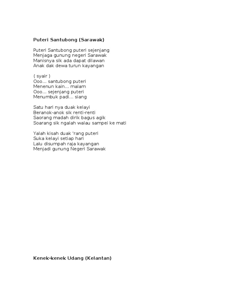 Lirik Lagu Puteri Santubong : Lirik Lagu Tempatan Pdf Document : Kalu diperhatikan, ada beberapa rangkap lirik yang menceritakan mengenai bagaimana 2 orang puteri ini bergaduh.. Lagu rakyat sarawak puteri santubong lyrics. So, bagi yang kurang hafal & kurang faham maksud lagu tu, apa kata kita nyanyi sama2, sambil cuba memahami dan menghayatinya : Tapi kalau lagu puteri santubong, berpeloh diorang ni nak ingat lirik. Tapi, disebalik lagu puteri santubong puteri sejinjang, sebenarnya pencipta lagu ini mempunyai tujuan lain. Rasanya ada kekurangan dengan lirik lagu puteri santubong yang diberikan di ruangan ini.